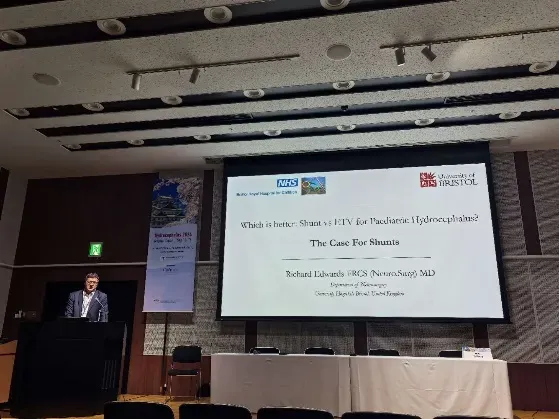 Richard Edwards 教授详细介绍 "V-P shunt"(脑室-腹腔分流术),这是一种历史悠久且广泛使用的方法,通过在脑室和腹腔之间植入分流管来调节脑脊液的流动。他指出尽管有部分儿童脑积水是肿瘤或导水管等原因梗阻引起可应用ETV手术,但大部分儿童脑积水更适合做VPS手术。